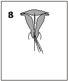 八、 輕輕地牽拉一下尾絲以確定吉妮已適當的固定于子宮底。然后,在距子宮外口 1.5—2cm 處剪斷尾絲,如果需要也可在子宮頸管內剪斷尾絲。