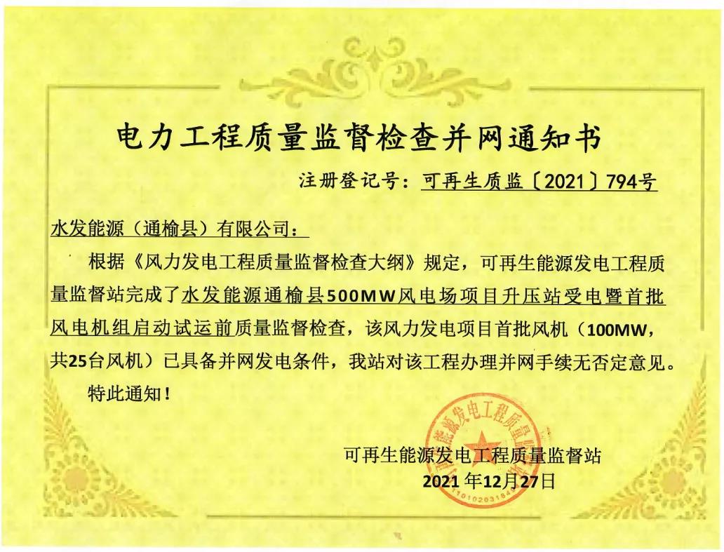 水發(fā)能源通榆縣500MW風(fēng)電場(chǎng)項目獲得首批風(fēng)機電力工程質(zhì)量監督檢查并網(wǎng)通知書(shū)